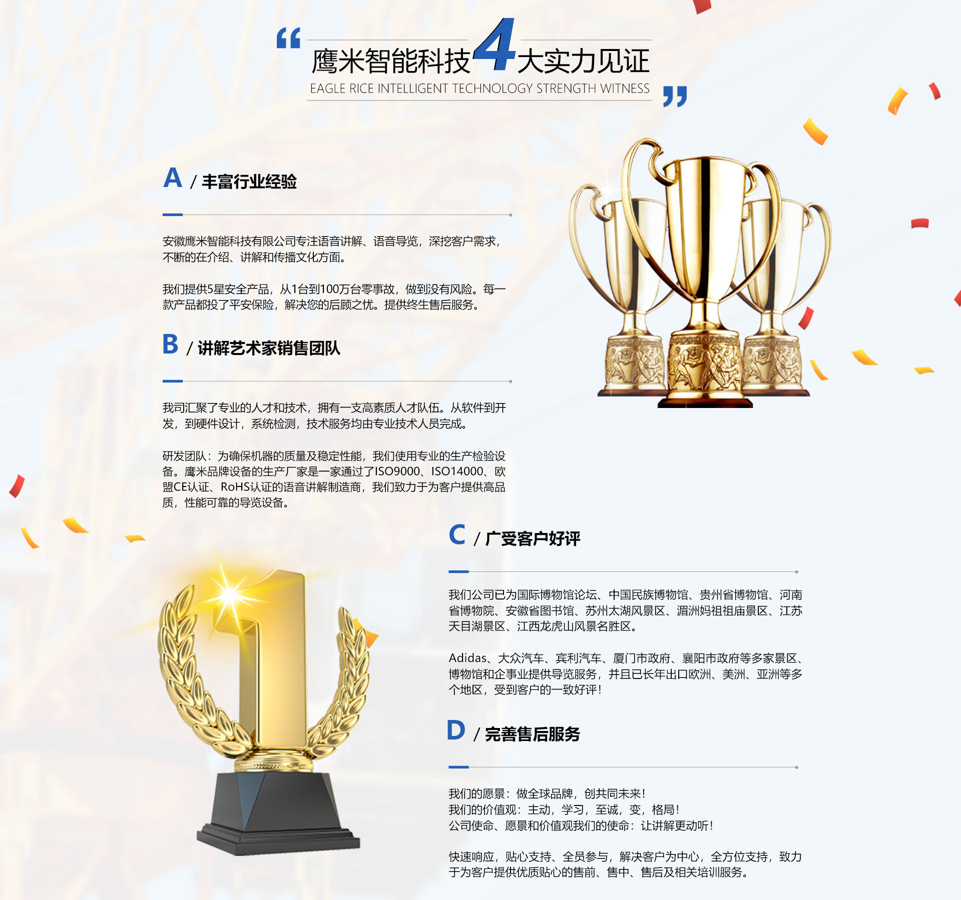 一、 公司簡介 安徽鷹米智能科技有限公司是專注開發、生產語音講解設備和系統的企業,公司地址位于安徽省合肥市(蜀山區)高新區星夢園。鷹米語音導覽專注于智能語音講解設備和系統的研發、生產、銷售,涵蓋了旅游導覽的信息化建設,我們已經為國內的國際博物館論壇、中國民族博物館、河南省博物院、安徽省圖書館以及中國黃金博物館、蘇州太湖風景區、湄洲媽祖祖廟景區、江蘇天目湖景區(國家5A景區)、江西龍虎山風景名勝區(5A、中國第八處世界自...